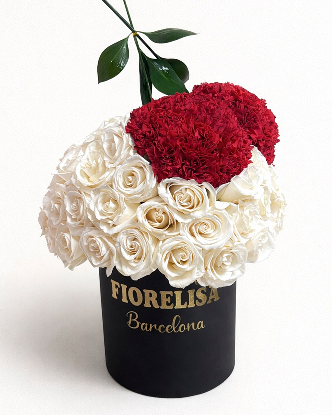 El contraste entre el blanco y el rojo crea una armonía visual elegante y romántica, presentada en una caja negra premium, ideal para regalar un detalle único y con significado.