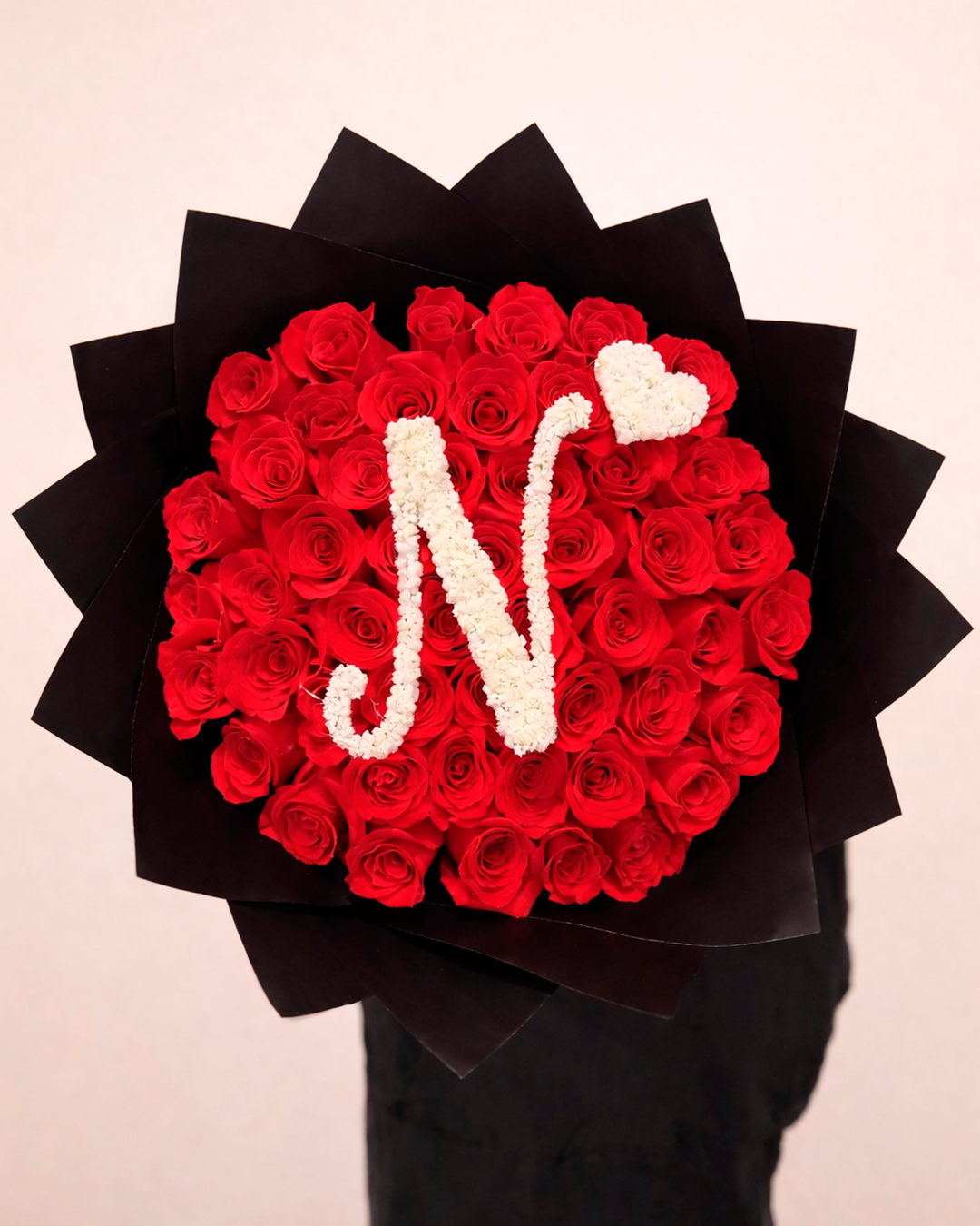 Este espectacular ramo está compuesto por rosas rojas de alta calidad, cuidadosamente organizadas para formar un diseño elegante. En el centro destaca una inicial personalizada elaborada con flores blancas, acompañada de un delicado corazón floral, convirtiendo este arreglo en un detalle profundamente romántico y personal.